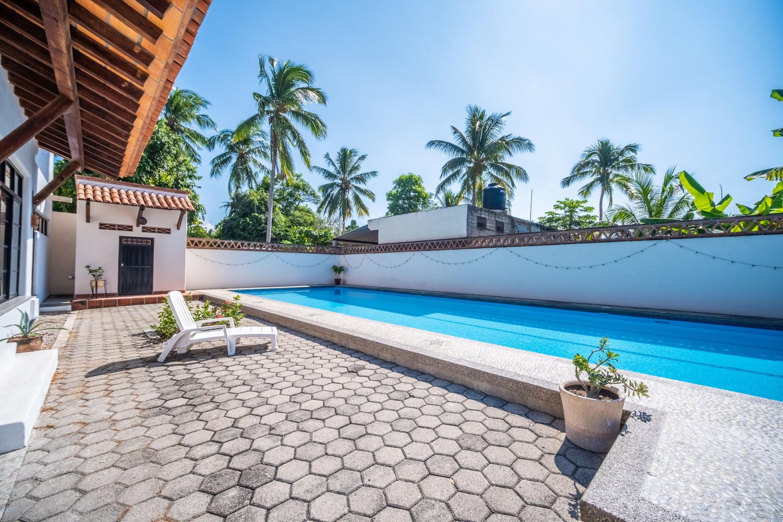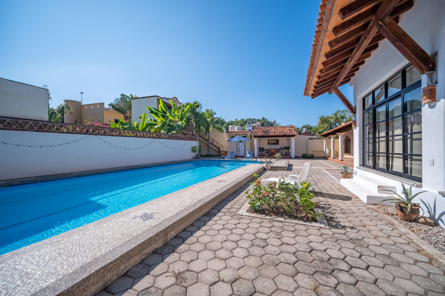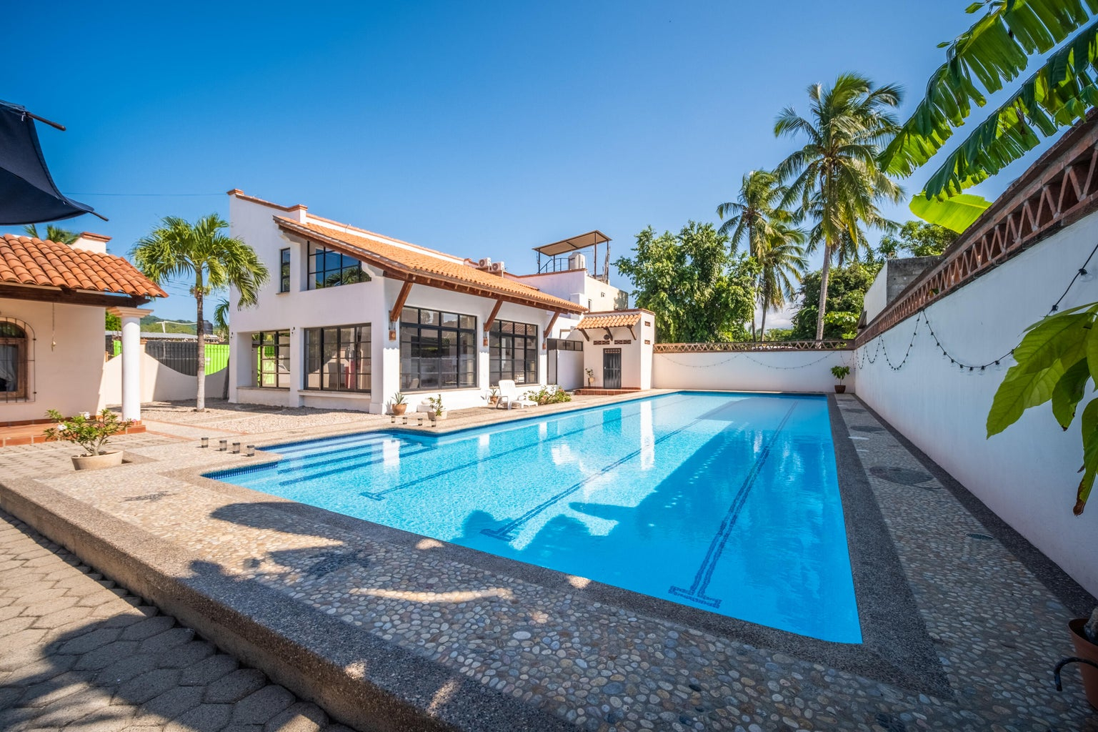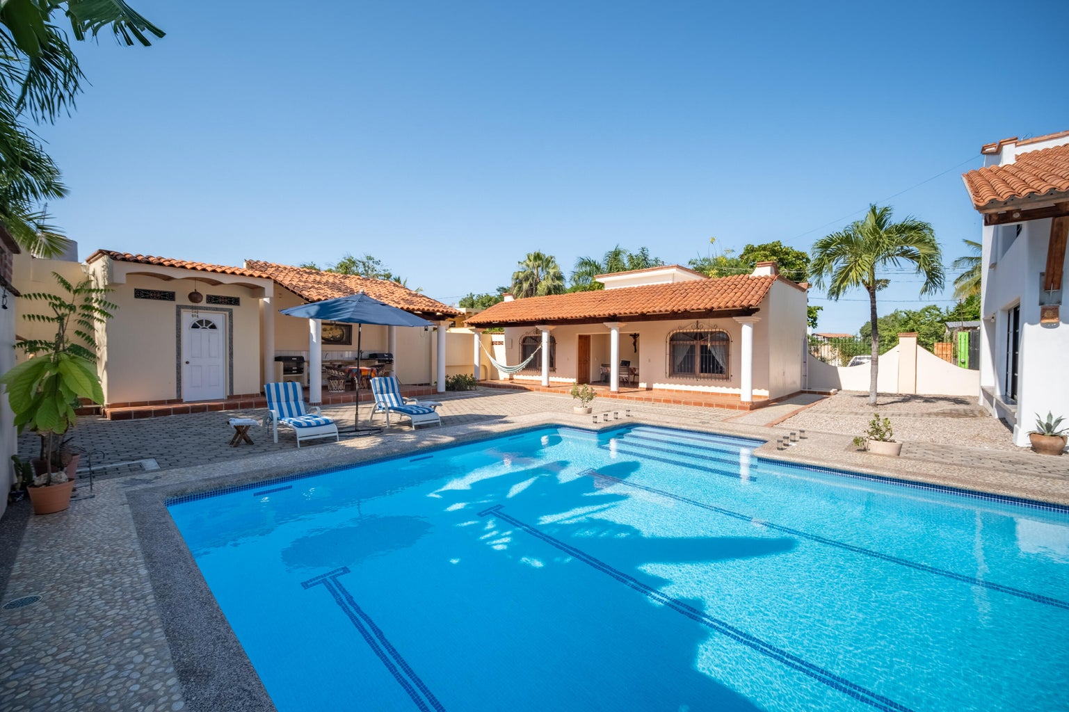Introducing ”Hacienda Braun” – a stunning property located on Privada Universidad Street, just three blocks from the beach in Lo de Marcos, Nayarit. This home, crafted by local architect Cesar, comprises three separate buildings. The main house boasts 2 bedrooms, 1.5 bathrooms, and a balcony with garden and pool views. Two one-bedroom suites with private bathrooms and kitchens, along with an additional suite above a full-size storage cellar, provide versatile living options. The outdoor haven includes Lo de Marcos’s largest saltwater pool, an 18-meter oasis approaching Olympic dimensions, complemented by a patio and an outdoor kitchen area with a barbecue. Priced at $895,000.00 USD, this 697 m2 property offers a harmonious blend of luxury and coastal living.